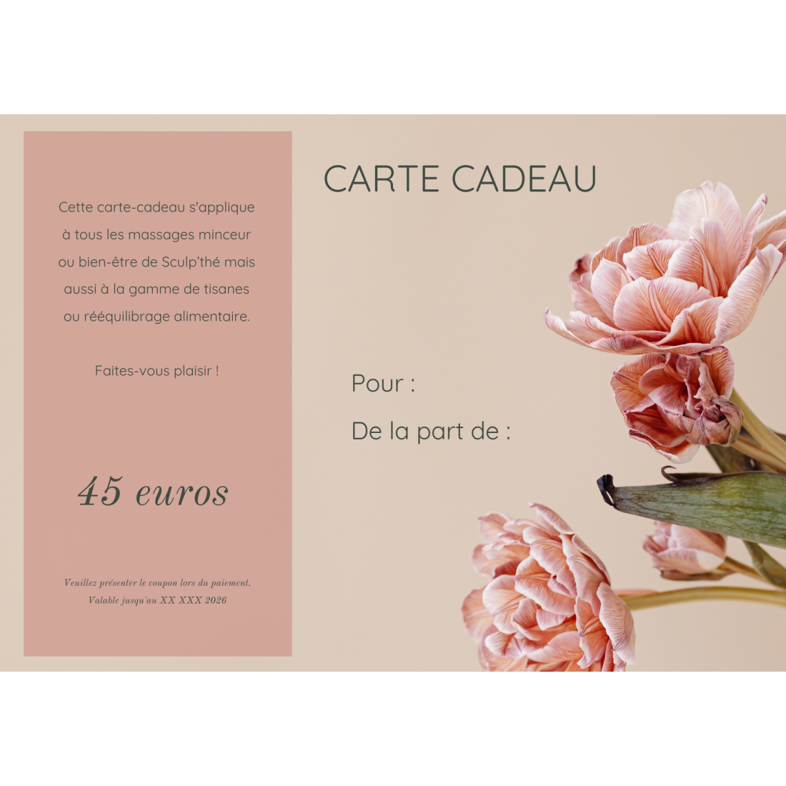Carte cadeau bien-être et minceur de 45€, simple à offrir et personnalisable. Valable sur massages, soins, programmes alimentaires et thés bien-être.