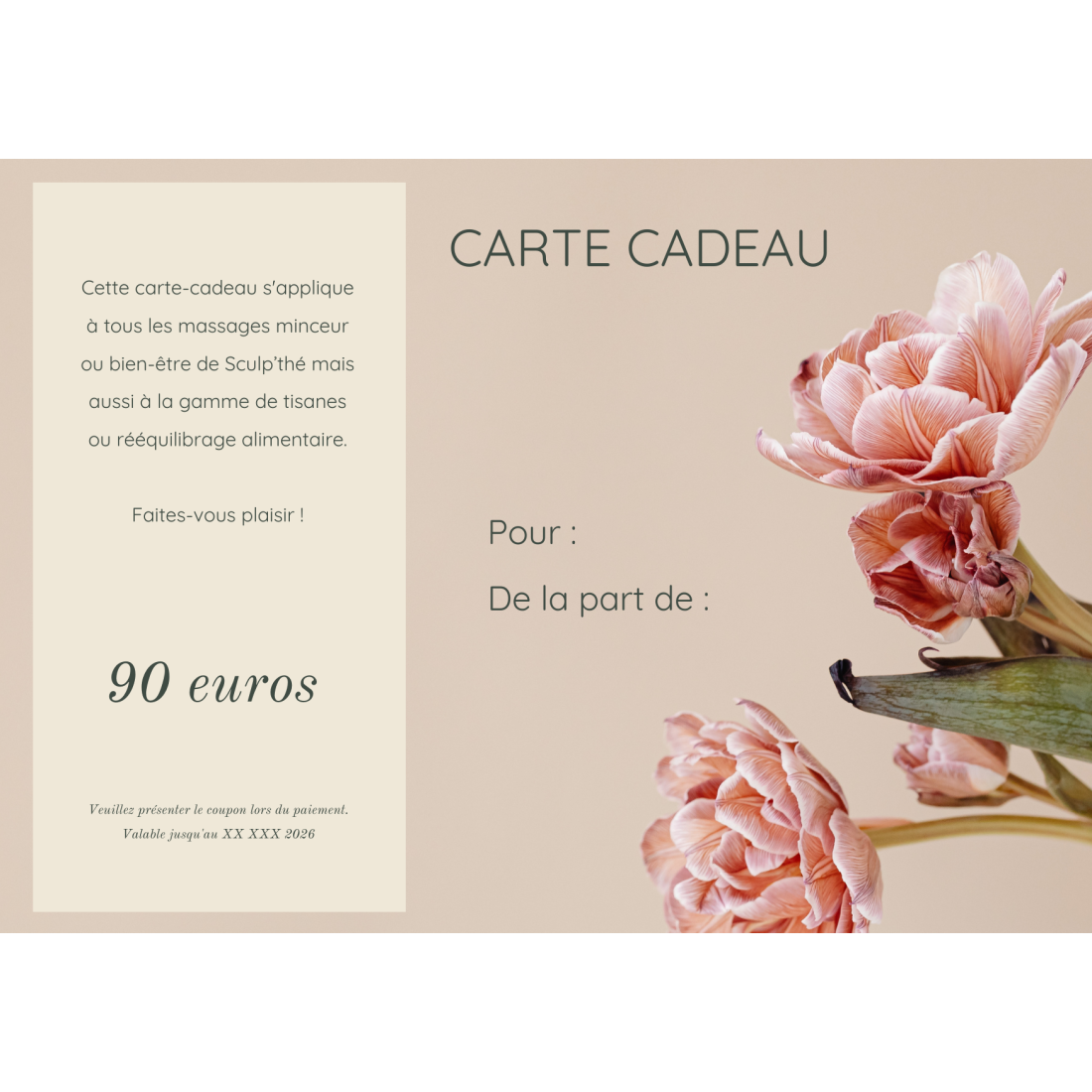 La carte cadeau 90€ est idéale pour offrir une expérience bien-être plus complète, adaptée aux besoins et aux objectifs de chacun. Elle permet de profiter de différents soins : massages minceur, drainage lymphatique, accompagnement en rééquilibrage alimentaire, ou encore sélection de tisanes et thés naturels.