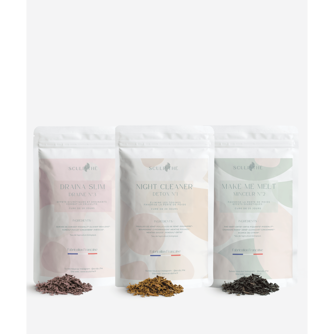 Ce pack réunit trois infusions complémentaires : une tisane détox, un thé minceur et une tisane drainante. Pensé pour accompagner votre quotidien, il permet de soutenir les fonctions naturelles de l’organisme tout en favorisant une sensation de légèreté et d’équilibre.
